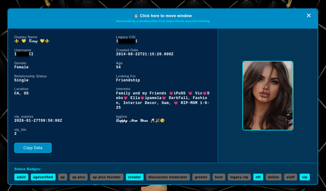 This new bookmarklet extracts hidden profile data from IMVU user profiles. When viewing a profile at https://www.imvu.com/next/av/USERNAME/, the bookmarklet fetches the underlying API data through an extra active API call and displays information not visible on the web interface—including precise ISO-formatted account creation and registration dates, Legacy CID (account identifier), relationship status, looking-for preferences, account flags (VIP, creator status, age verification, etc.), feature flags, online status, and the profile thumbnail image.