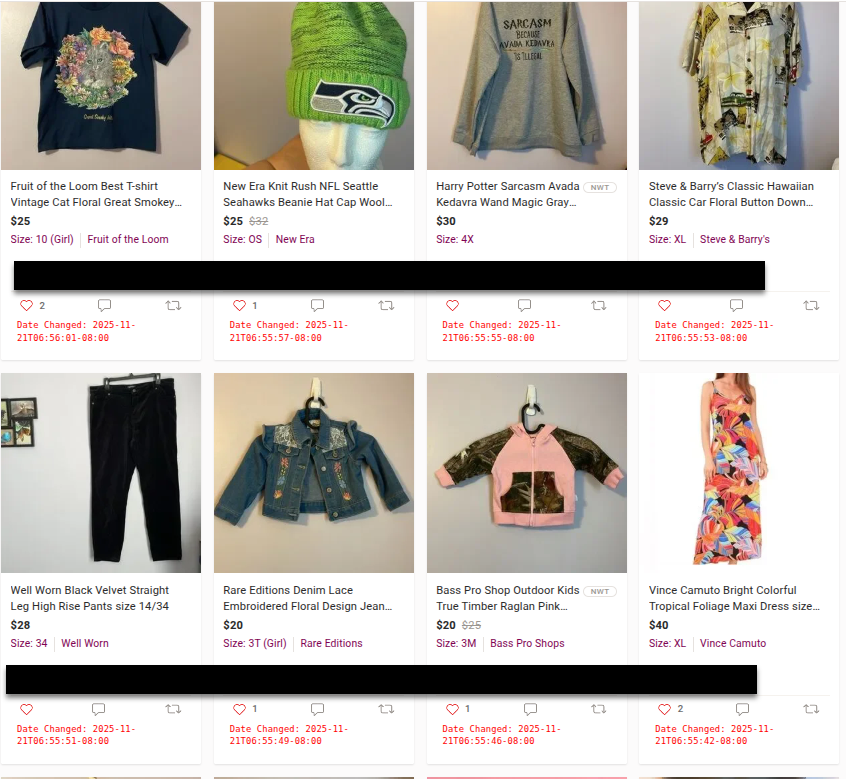By showing the updated dates and times, analysts can hone in on listings and activity that are relevant to their investigations. Simply visit a Poshmark user page (like the one previously mentioned) and activate the bookmarklet to show the dates and times in red at the bottom of each listing.