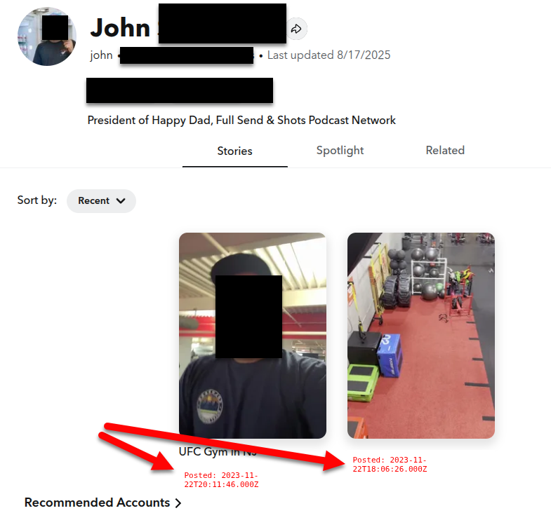 This not only helps the OSINT analyst see creation and last used dates/times of the user account but also which boards were updated when.