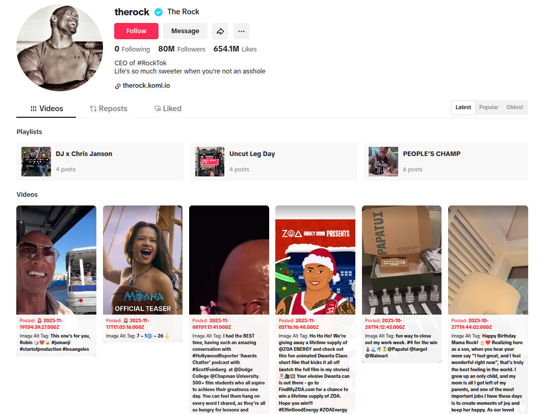 This bookmarklet is used on TikTok user profile pages. It adds the date and time to each video or reposted video on the page and reveals the image alt tag data as well so you can easily see the dates without clicking each video.