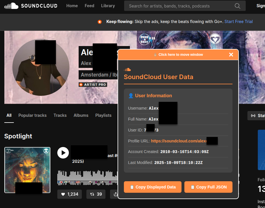 This bookmarklet extracts the creation and last updated dates from a Soundcloud profile page.