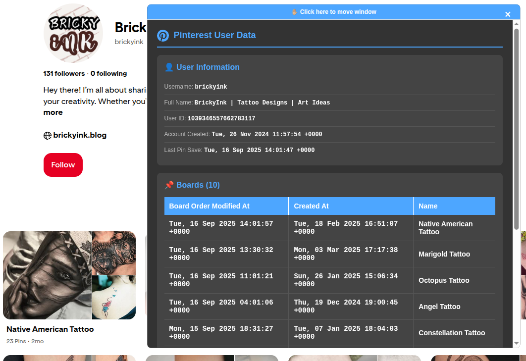 This bookmarklet is used on Pinterest user profile pages. The extracts user data and then grabs dates and times for 10 "boards". It then displays a modal with the user data and a table to display most recent board modifications. It also copies the data to your computer's clipboard for easy pasting into your notes.