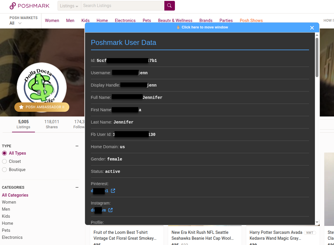 Some interesting pieces of data you might find in Poshmark profiles using this bookmarklet include: