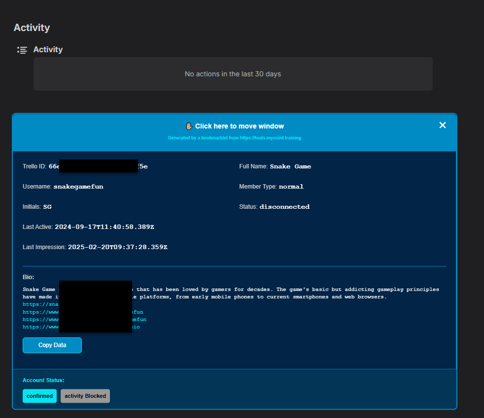 This new bookmarklet extracts hidden profile data from Trello user profiles. When viewing a profile at https://trello.com/u/username/activity, the bookmarklet fetches the underlying API data through an extra active API call and displays information not visible on the web interface.